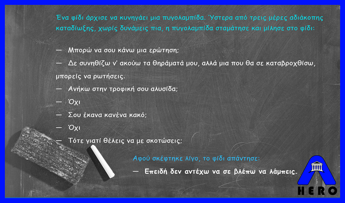 Ένα φίδι άρχισε να κυνηγάει μια πυγολαμπίδα. Ύστερα από τρεις μέρες αδιάκοπης καταδίωξης, χωρίς δυνάμεις πια, η πυγολαμπίδα σταμάτησε και μίλησε στο φίδι: — Μπορώ να σου κάνω μια ερώτηση;